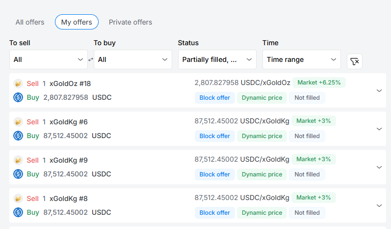 1. Explore and filter all available offers in an easy to read orderbook, where users can also find their own offers and any private offers intended just for them.