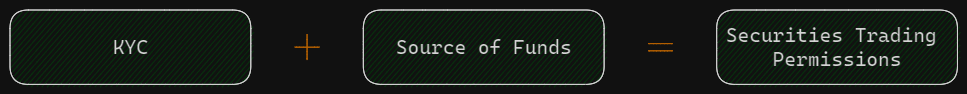 Onboarding a new user to trade real world assets requires them to obtain two permissions, granted as non-transferable NFTs to the user’s address.